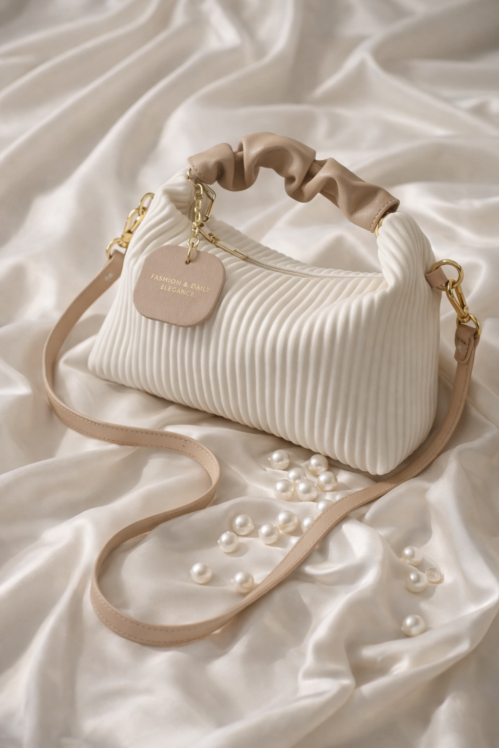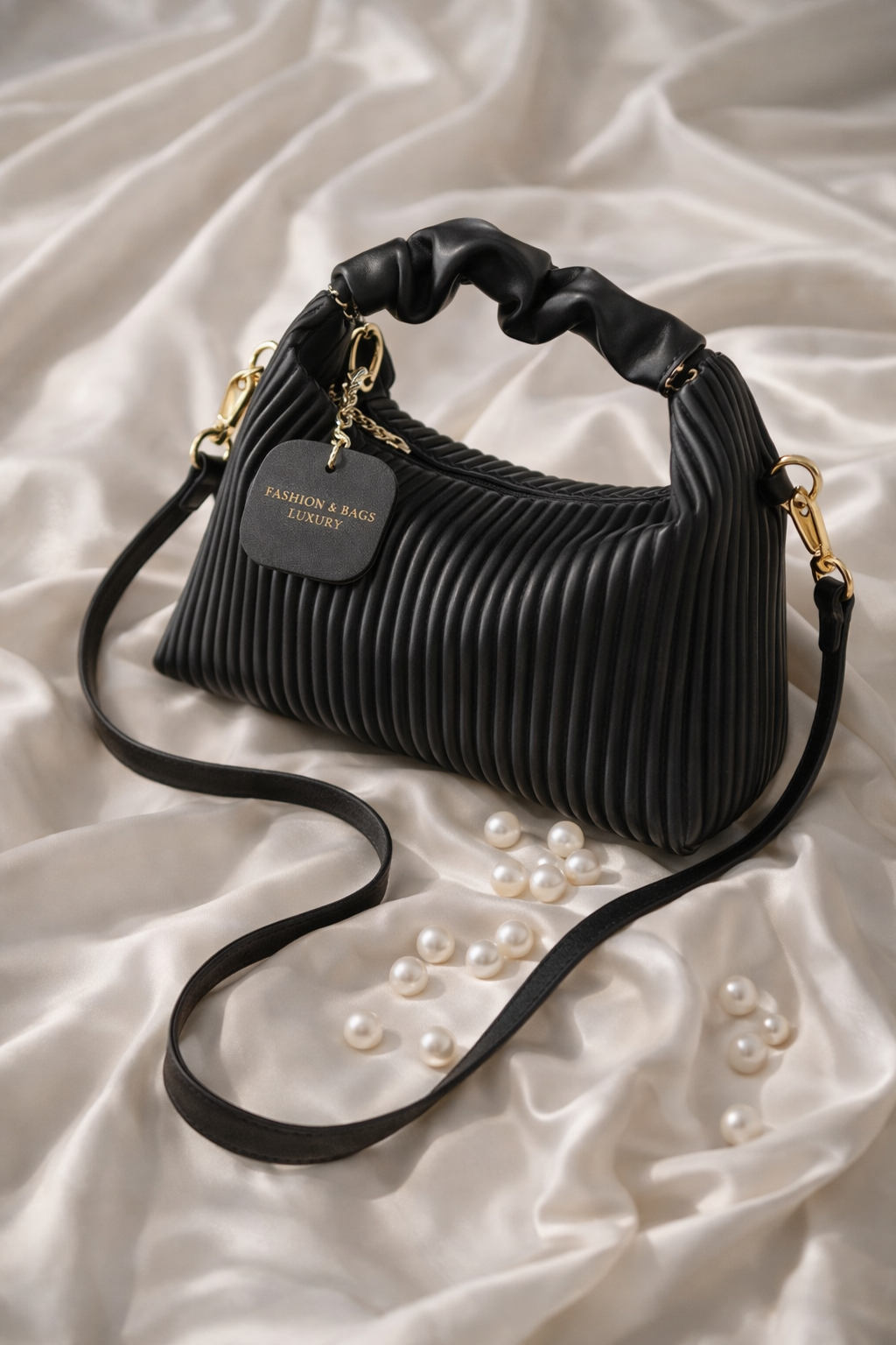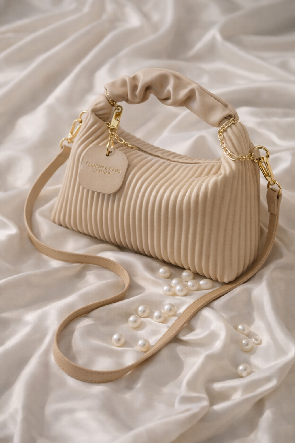 The pleated design adds a refined, modern touch, while the adjustable shoulder strap allows you to wear it as a crossbody or carry it as a chic handbag. Finished with subtle gold-tone details, this bag blends effortlessly with a wide range of outfits.